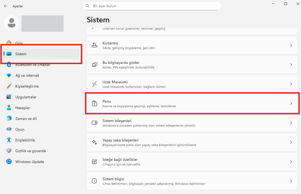 Windows 11 işletim sisteminde kopyalama geçmişi yani pano geçmişi özelliğini aktif etmek için öncelikle Windows’un Ayarlar bölümüne giriş yapın. Daha sonra Sistem > Pano bölümüne girin.