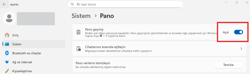 Açılan ekranda Pano Geçmişi özelliği Açık olarak ayarlayın.